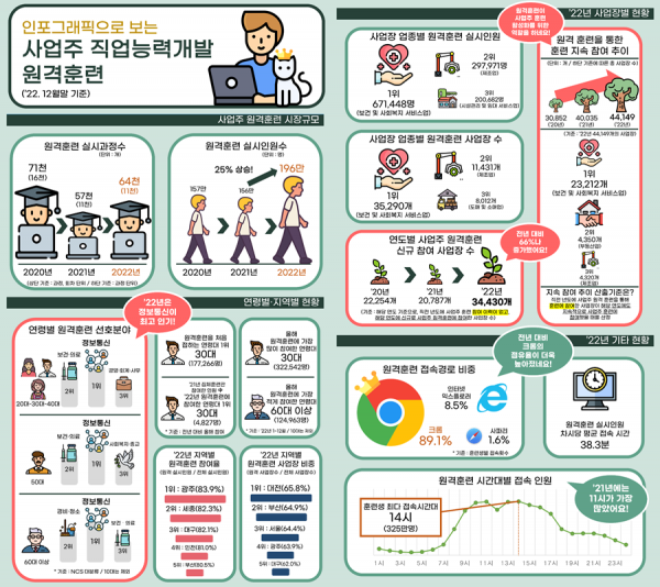 [세종타임즈] 한국산업인력공단은 2022년도 사업주 직업능력개발 원격훈련 현황의 인포그래픽 안내자료를 발표했다.