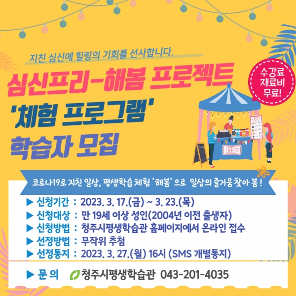 [세종타임즈] 청주시평생학습관은 코로나19 이후 시민과 소상공인의 빠른 일상회복을 돕기 위해 ‘심신 프리-해봄 프로젝트’의 학습자를 모집한다고 16일 밝혔다.