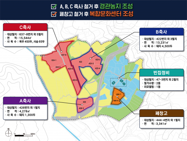 약 33,053㎡ 규모의 돼지와 소축사를 철거하고 경관농지를 조성한다.