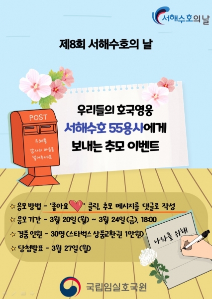 행사는 3월 20일부터 24일까지, ‘서해수호의 날’을 기념해 우리들의 호국영웅 서해수호 55용사에게 보내는 추모 이벤트를 진행 할 예정이며 이벤트는 인스타그램을 통해 참여할 수 있다.