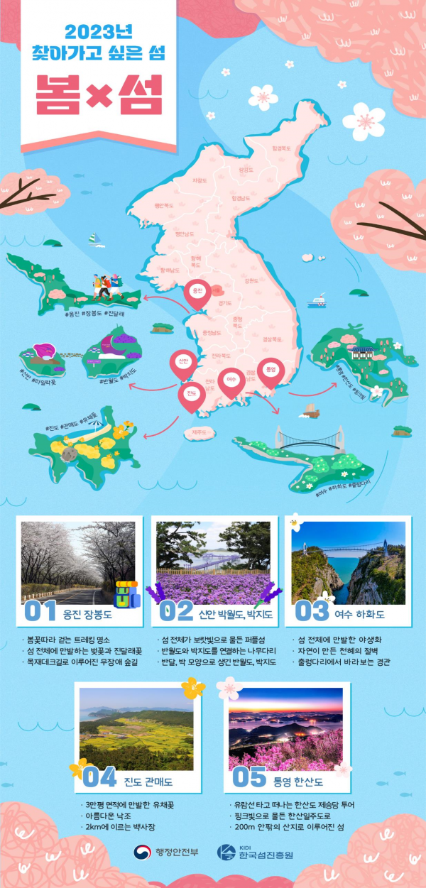 [세종타임즈] 행정안전부는 봄을 맞아 다양한 볼거리와 즐길거리가 있는 섬 5곳을 ‘찾아가고 싶은 봄섬’으로 선정했다.