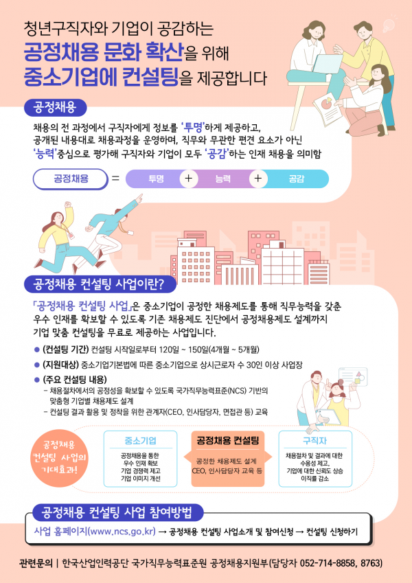 [세종타임즈] 고용노동부와 한국산업인력공단은 3.21. ‘공정채용 컨설팅’ 사업을 신규 시행하고 채용 제도에 대한 정보·체계가 부족한 중소기업 150개소를 직접 찾아가 공정채용 제도의 설계·도입을 무료로 지원한다.