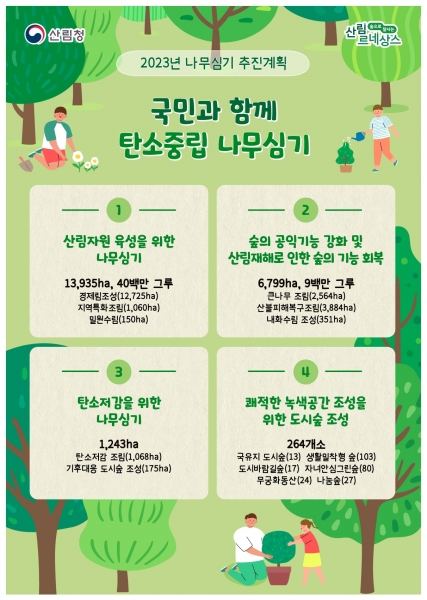 이와 함께 도로변·생활권 경관 조성을 위한 나무심기와 2021∼2022년 발생한 대형산불 피해지의 조속한 복원을 위한 나무 심기, 대형산불로의 확산을 방지할 수 있는 내화수림대 조성도 적극 추진한다.