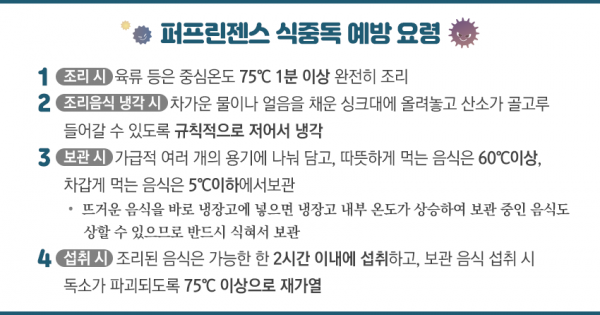 퍼프린젠스로 인한 식중독은 음식 조리·보관 시 주의를 기울이면 충분히 예방할 수 있으므로 급식소나 대형 음식점 등에서는 조리식품의 보관방법과 온도를 준수하는 것이 중요한다.