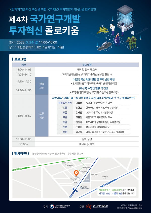 [세종타임즈] 과학기술정보통신부는 3월 24일 서울 대한상공회의소에서 국방과학기술 연구개발 투자방향과 민·관·군 협력방안 등을 주제로 ‘제4차 국가연구개발투자혁신 콜로키움’을 개최했다고 밝혔다.
