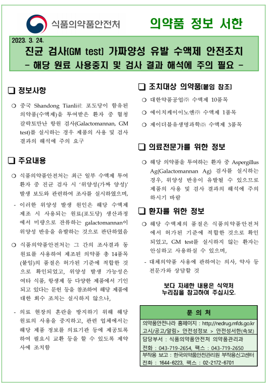 이번 조치는 해당 포도당을 사용해 제조한 영양 수액제를 투여한 환자에 대한 진균 검사 시 포도당 원료에 미량 잔류하는 ‘갈락토만난’ 성분으로 인해 ‘가짜 양성’ 진단 결과를 유발할 수 있음이 확인됨에 따라 의료현장의 혼란을 방지하기 위한 것이다.