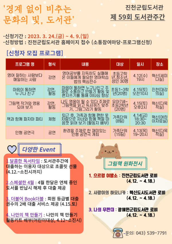 사전접수가 필요한 프로그램은 오는 4월 9일까지 진천군립도서관 홈페이지에서 신청 가능하며 기타 자세한 사항은 진천군립도서관 도서관운영팀으로 문의하면 된다.