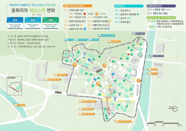 한편 영동군은 2016년 도시형 새뜰마을 공모사업으로 영동 부용지구가 선정되어 완료했고 농촌형은 2019년 선정된 심천면 장동지구 완료됐다.