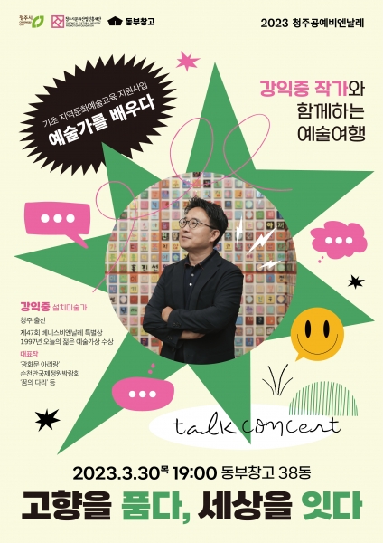 한편 ‘청주 기초 지역문화예술교육 지원사업 – 예술가를 배우다’ 토크 콘서트를 통해 시민들을 만나는 설치미술가 강익중은 같은 날 2023 청주공예비엔날레 홍보대사로도 위촉돼 고향 청주와 세계를 연결하는 역할을 이어간다.