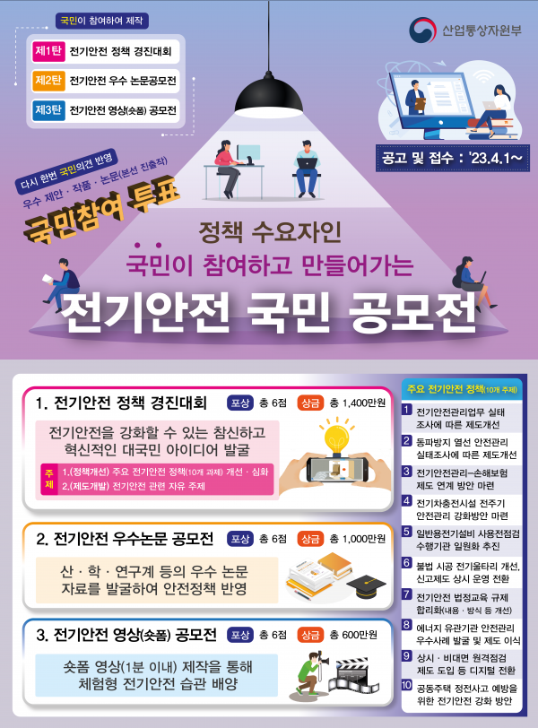 이번 공모전은 산업부에서 이전 발표한 전기안전 정책 중 주요 정책 10가지를 선정해 관련 정책을 개선·심화할 수 있는 정책개선 분야도 마련했다.