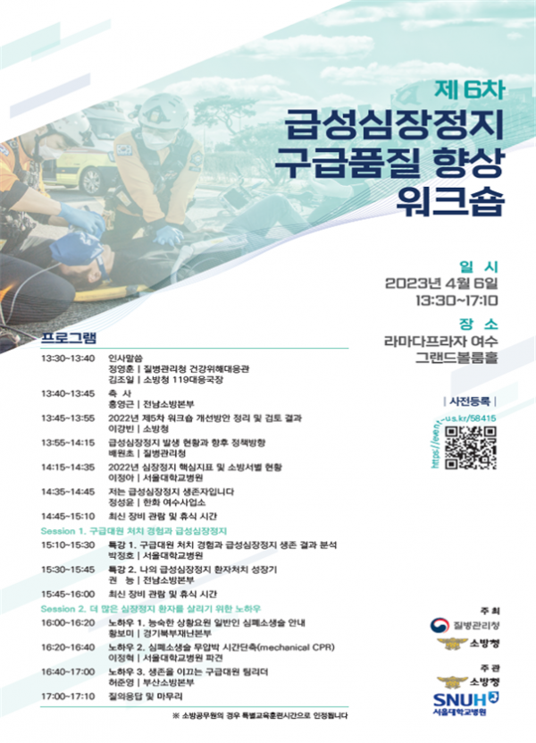 이번 제6차 워크숍은 급성심장정지 발생 현황과 향후 정책방향, 2022년 심장정지 핵심지표 및 소방서별 현황, 구급대원 처치 경험과 급성심장정지 생존 결과 분석, 심폐소생술 무압박 시간단축 노하우와 같이 신고단계부터 현장, 이송단계의 급성심장정지 환자 인지 및 처치의 중요성과 통계 등의 발표와 사례 공유로 진행된다.