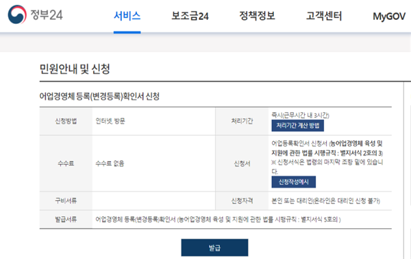 해양수산부는 종전에는 11개 지방해양수산청을 직접 방문하거나 팩스를 보내야만 신청이 가능하던 ‘어업경영체등록확인서’ 발급을 온라인화했다.