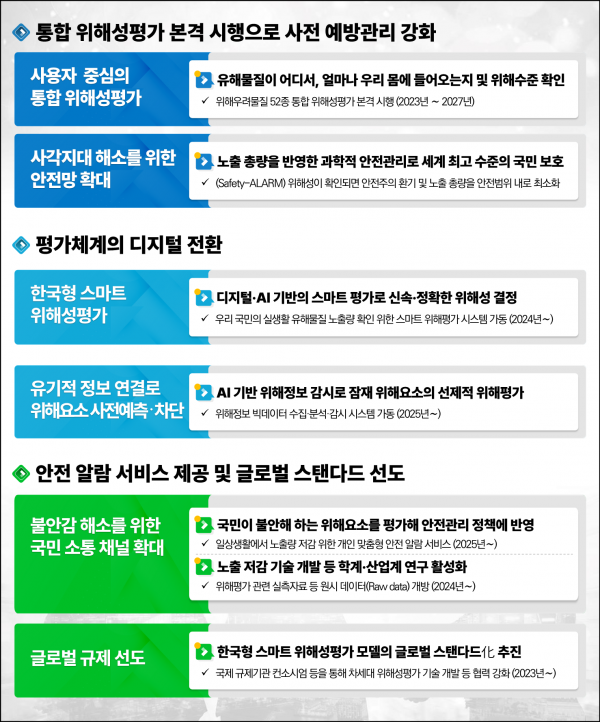 우선 올해부터 ’27년까지 발암·생식능력 손상·유전독성 등 위해 우려가 높은 유해물질 52종에 대해 얼마나 인체에 영향을 주는지 통합 위해성 평가를 본격 실시한다.