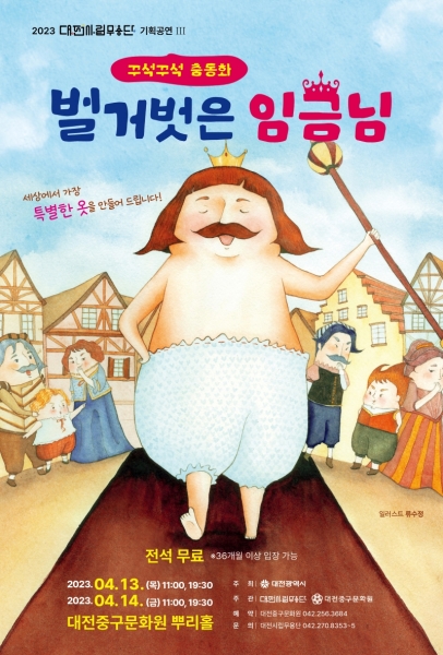 [세종타임즈] 대전시립무용단은 원도심 활성화와 더불어 어린이들에게 문화 예술을 향유하고 꿈을 키우는 꾸석꾸석 춤동화 ‘벌거벗은 임금님’공연을 오는 4월 13일부터 4월 14일까지 이틀간 대전중구문화원 뿌리홀에서 개최한다.