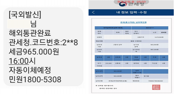 끝으로 “보이스피싱 또는 관세청 사칭이 의심되는 경우 관세청 대표번호인 1544-1285나 국번없이 125로 전화해 문자의 진위여부를 직접 확인할 필요가 있다”고 밝혔다.