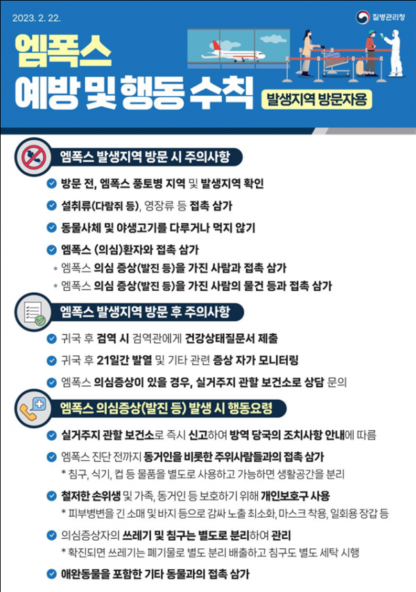 위기경보수준 격상에 따라 질병관리청은 현재 운영중인 엠폭스 대책반을 중앙방역대책본부로 격상하는 등 대응 조치를 강화하고 지자체는 확진자 발생지역 및 인접지역을 중심으로 지역방역대책반을 설치할 예정이다.