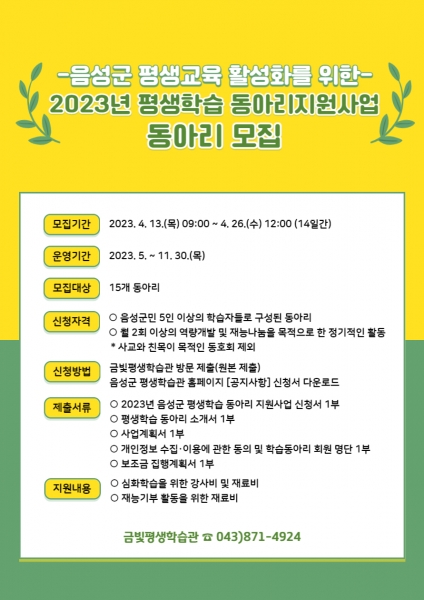 2023년 음성군 평생학습동아리 지원사업에 대한 자세한 내용은 음성군 평생학습관 누리집 공지 사항을 참고하면 된다.