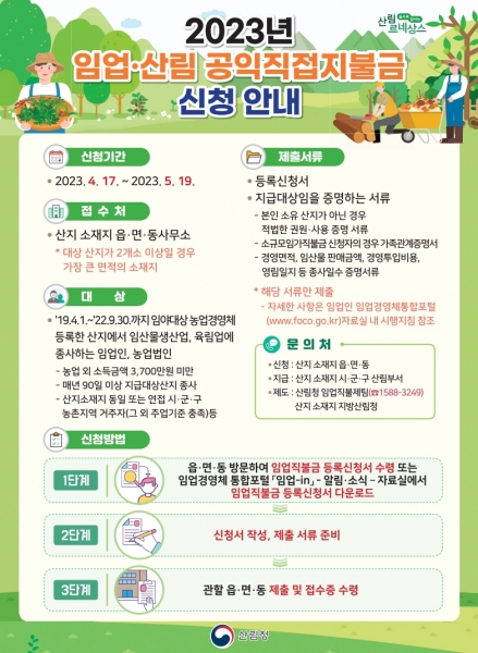 신청을 희망하는 임업인은 청주시 홈페이지에서 자격요건 등을 확인한 후 오는 17일부터 5월 19일까지 산지 소재지 읍·면·동 행정복지센터를 방문해 신청하면 된다.