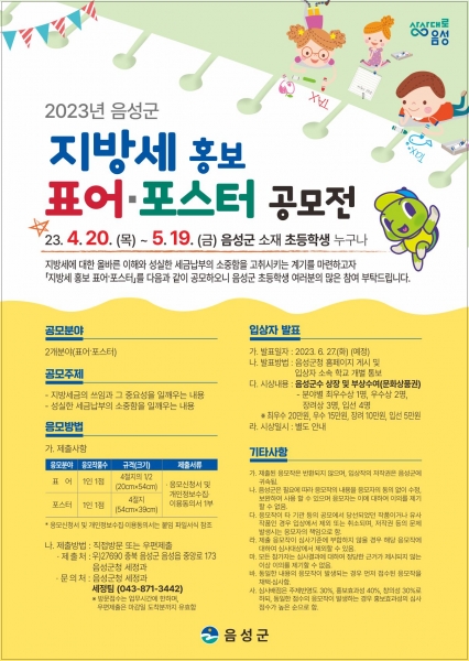 이번 공모전은 음성군 소재 초등학교 재학생이면 누구나 참여 가능하며 공모 분야는 표어·포스터 2개 분야로 지방세의 중요성, 성실한 세금 납부의 소중함, 납세 의식을 높일 수 있는 내용을 주제로 구성돼 있다.