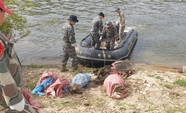공주전우회 회원 40여명은 이날 약 3시간에 걸쳐 고무보트 및 수쿠버 인력을 활용해 각종 쓰레기를 수거했다.