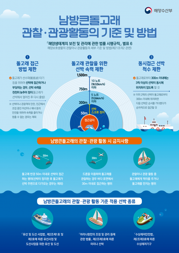정도현 해양수산부 해양환경정책관은 “제주연안에 서식하는 남방큰돌고래는 그 개체수가 적고 오랫동안 제주바다를 지켜온 소중한 해양생물인 만큼, 보호를 위한 모두의 노력이 필요하다”며 “이번 개정사항이 잘 지켜질 수 있도록 관광업계를 비롯한 국민들의 지속적인 관심과 동참을 부탁드린다”고 말했다.