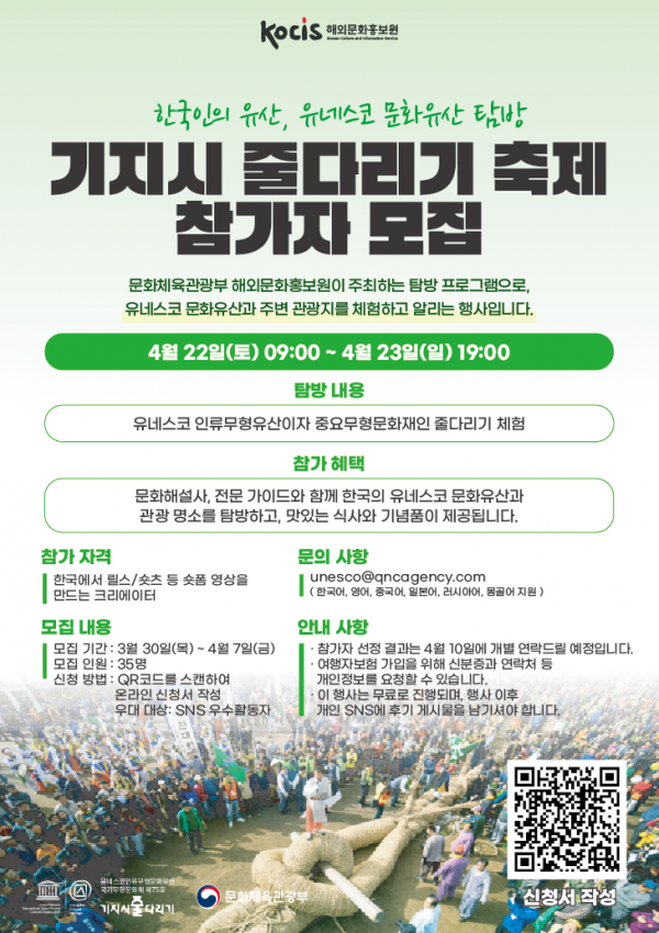 특히 올해는 유네스코 문화유산 탐방 사업 10주년이자 인류무형문화유산 보호 협약 20주년이 되는 해이면서 2022년 ‘탈춤’의 인류무형문화유산 등재로 한국이 유네스코 인류무형문화유산 보유 세계 2위 국가가 된 것을 기념해 줄다리기와 줄타기, 판소리, 택견, 해녀, 탈춤, 씨름, 김장 등 인류무형문화유산 체험으로 특화한 프로그램을 선사한다.