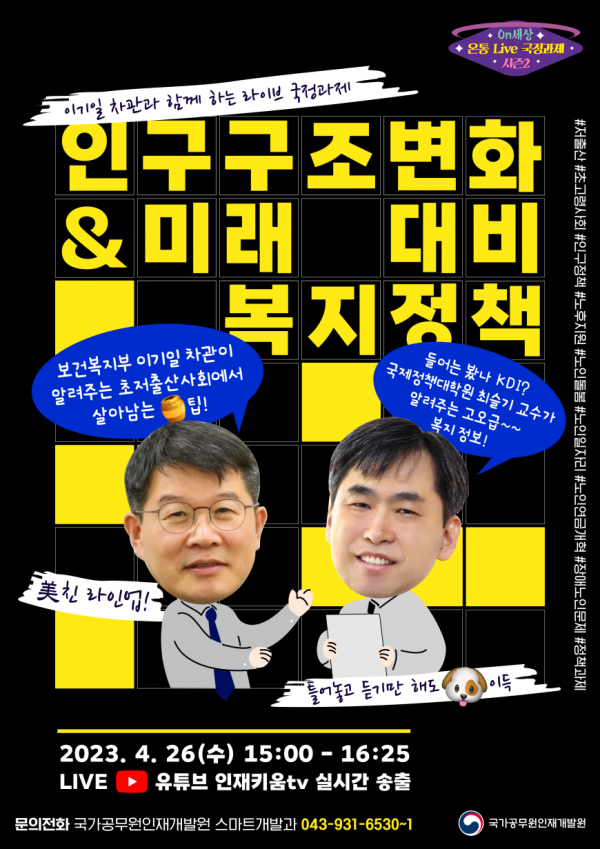 국가공무원인재개발원은 오는 26일 오후 3시부터 ‘인구구조 변화에 따른 미래 대비 복지정책’을 주제로 실시간 유튜브 공개강좌 ‘온통 실시간 국정과제’를 진행한다고 25일 밝혔다.