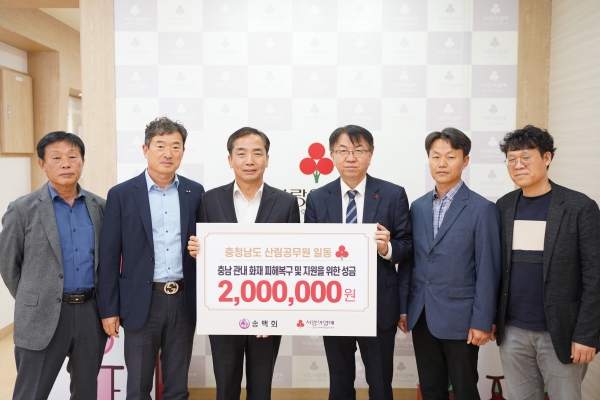 [세종타임즈] 충남도는 26일 이달 초 큰불로 피해를 받은 홍성 등 5개 시군의 산불 피해 복구와 이재민 지원을 위해 도 산림 공무원들이 십시일반 모은 성금 200만원을 충남사회복지모금회에 전달했다고 밝혔다.