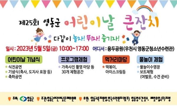 영동군 어린이날준비위원회 주관으로 행사 당일 오전 10시부터 오후 3시까지 볼거리, 먹거리, 즐길거리가 가득한 체험과 공연이 다채롭게 펼쳐진다.