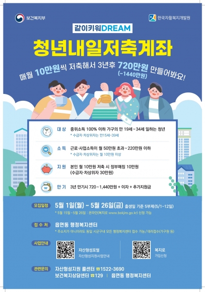 청년내일저축계좌는 연령, 소득, 가구소득, 가구재산 기준을 충족하는 청년이 3년 간 근로활동을 지속하고 매월 적금 납입 및 교육 이수 등 지급요건을 충족하면 매월 10~30만원의 정부지원금을 지원하는 사업이다.