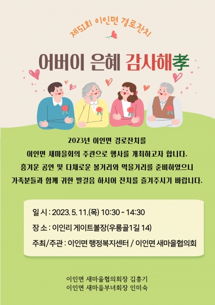 경로잔치는 이인면 새마을협의회가 주관해 관내 소재지에 거주하는 65세 이상 어르신, 주민 및 기관단체장을 대상으로 개최할 예정이다.