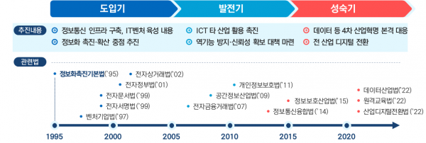 온라인에서의 문서처리와 신원확인, 인터넷을 통한 구매와 금융거래 등을 위해 정부는 정보화촉진기본법을 시작으로 전자문서법, 전자서명법, 전자상거래법, 전자금융거래법 등 입법적 조치와 함께 국가정보화기본계획 수립, 전자정부 구축 등 범부처 차원의 정보화 정책들을 강력하게 추진했다.