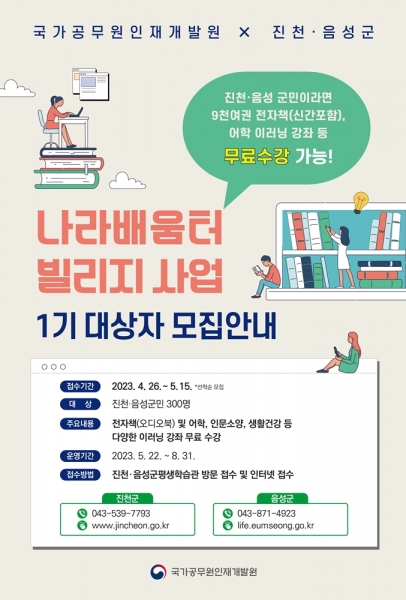 한편 음성군에서는 2020년부터 나라배움터 빌리지 사업을 추진해 많은 주민들이 시간적, 공간적 제약 없이 평생학습에 참여할 수 있도록 온라인 평생학습 활성화에 앞장서고 있다.