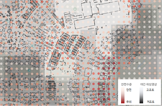이후, 해당 지역의 위성 이미지 데이터 분석을 통해 야간 조명이 부족해 어두운 구역을 추출함으로써 방범 시설물 설치가 우선적으로 필요한 구역을 도출했다.
