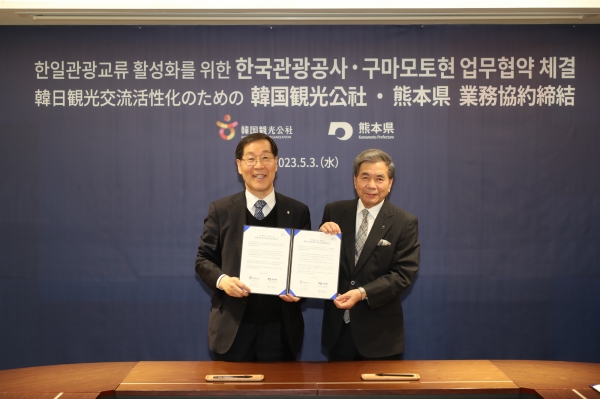 [세종타임즈] 한국관광공사와 일본 구마모토현은 5월 3일 서울 하이커그라운드에서 한국관광 대표 홍보캐릭터 ‘호종이’와 일본 대표 캐릭터 ‘구마몬’을 한일관광 친선대사로 임명하는 한일 관광협력 증진을 위한 업무협약을 체결했다.