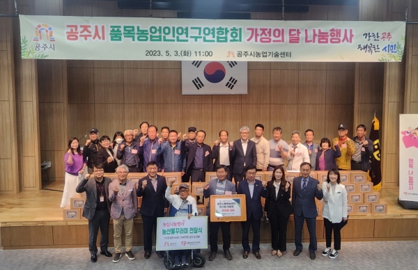 이번 행사는 16개 품목농업인연구회가 참여한 가운데 공주시장애인종합복지관을 통해 독거노인, 장애인, 소년소녀가장 등 차상위 계층에게 연구회원들이 직접 재배하고 사육한 농·축산 생산물을 포장한 박스를 전달했다.