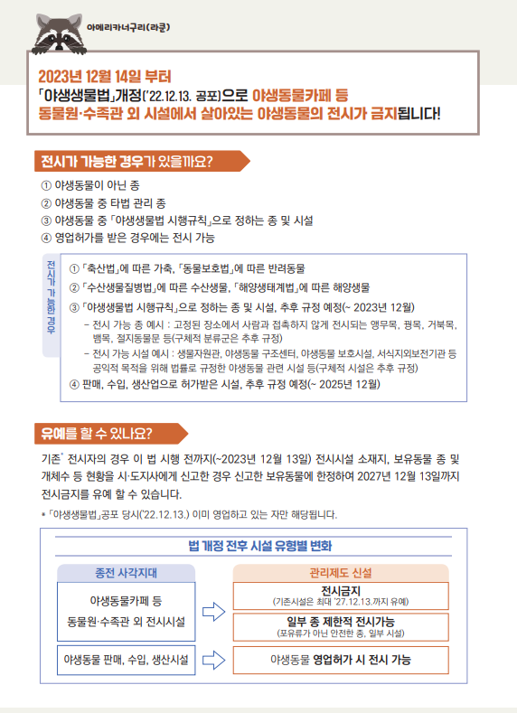 한편 환경부는 올해 12월 14일부터 시행되는 ‘야생생물 보호 및 관리에 관한 법률’에 따라 동물원·수족관으로 허가받지 아니한 시설에서는 살아있는 야생동물의 전시가 금지된다고 밝혔다.