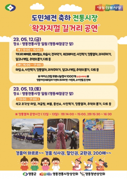 12일과 13일 오후 1시부터 5시까지 영동새참공간 등 영동전통시장 일원에서 누구나 즐길 수 있는 키다리 삐에로 전자악기 등의 공연과 레크레이션, 깡통열차, 달고나 게임, 추억의 뽑기 등이 진행된다.