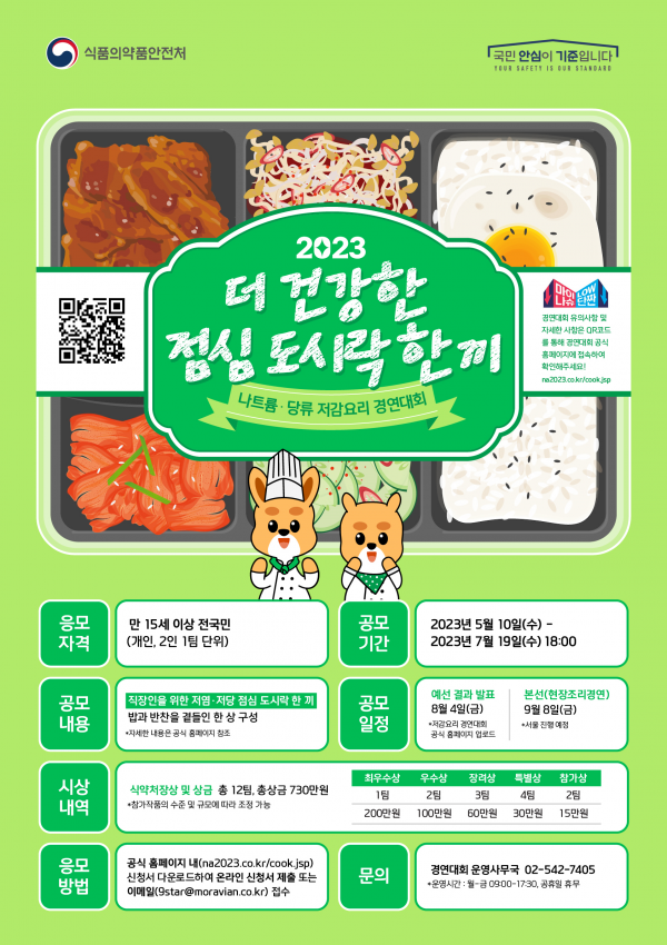 [세종타임즈] 식품의약품안전처는 최근 편의성 추구와 1인 가구 증가 등으로 도시락 수요가 늘어남에 따라 건강한 식생활 환경을 조성하기 위해 ‘맛과 영양을 더한 저염·저당 점심 도시락 한 끼’를 주제로 요리경연대회를 개최한다.