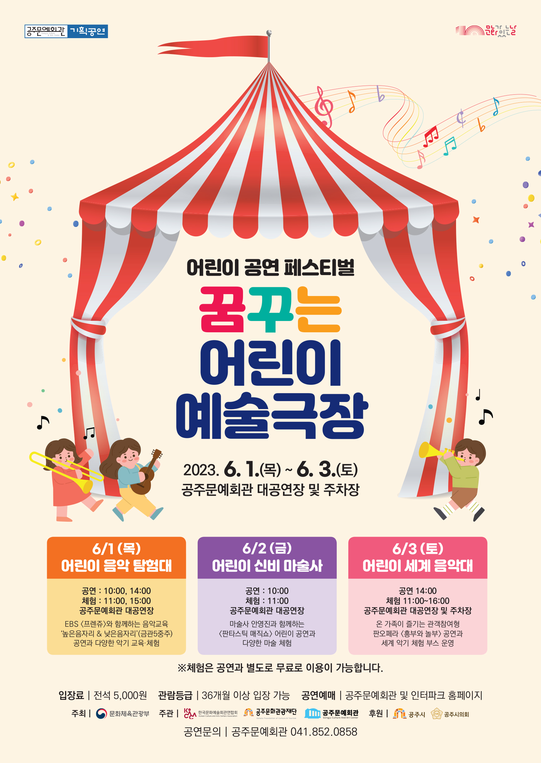 [세종타임즈] (재)공주문화관광재단에서 <어린이 공연 페스티벌 ‘꿈꾸는 어린이 예술극장’>을 6월 1일(목)부터 6월 3일(토)까지 삼일간 공주문예회관에서 개최한다.