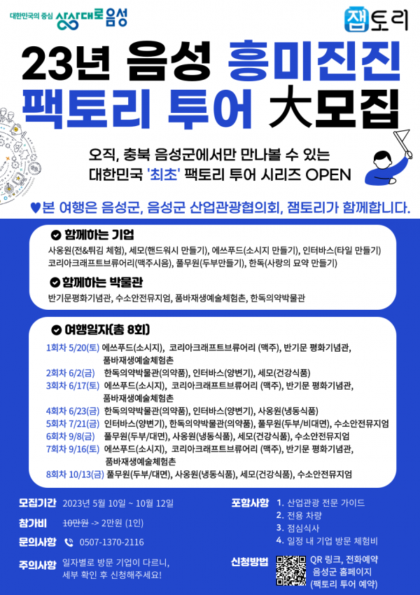 음성군과 음성군산업관광협의회, 잼토리가 함께하는 산업관광 여행 프로그램인“음성군 흥미진진 팩토리 투어”는 5월 20일부터 10월까지 8회 운영된다.