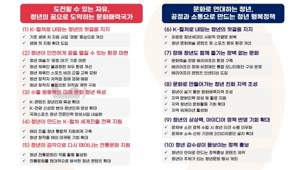 문체부는 이번에 발표하는 ‘청년문화정책 10대 과제’의 세부 과제를 중심으로 문화예술·관광·체육 현장의 청년과 전문가들의 의견을 수렴하고 개선책을 마련해 오는 12월에 최종 발표할 계획이라고 전했다.