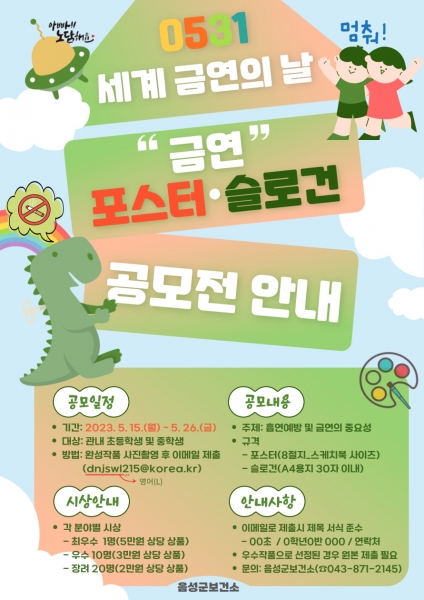 [세종타임즈] 음성군 보건소는 5월 31일 금연의 날을 기념해, 관내 초·중등생을 대상으로 흡연에 대한 올바른 가치관 형성과 건강한 지역사회 금연 분위기 확산을 위해 비대면 금연 포스터 및 슬로건 공모전을 개최한다고 16일 밝혔다.