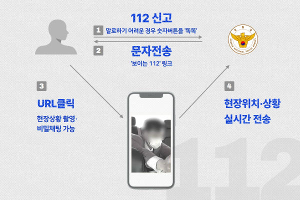 경찰청 관계자는 “112 신고 후 안내에 따라 숫자 버튼을 똑똑 누르면 ‘보이는 112’ 접속을 통해, 실시간 영상 전달, 위치확인, 비밀채팅이 가능하다는 것을 잊지 말고 말하기 어려운 위급상황에서 적극적으로 이용해 달라”고 당부했다.