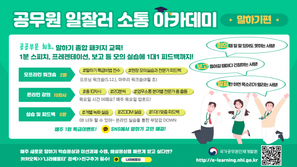 국가인재원 김재선 스마트개발과장은 “많은 공무원이 보고 발표 등 말하기에 어려움을 겪고 있어 이를 극복할 수 있는 교육프로그램을 고민했다”며 “모든 공무원이 소통을 잘할 수 있도록 말하기·글쓰기 등 온라인 중심의 참여형 교육과정들을 지속적으로 개발해내겠다”고 말했다.
