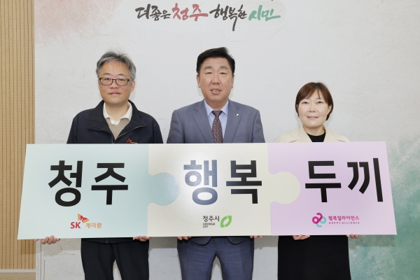 [세종타임즈] 청주시는 17일 임시청사 직지실에서 SK케미칼 청주공장과 행복얼라이언스 사무국 행복나래와 함께 2023년 ‘행복두끼 프로젝트’와 관련, 결식아동 급식 지원에 대한 전달식을 가졌다.