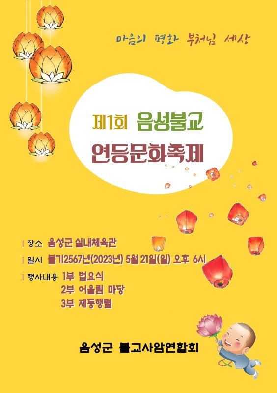 [세종타임즈] 음성군 불교사암연합회가 불기 2567년 부처님 오신 날을 맞아 21일 오후 6시 음성체육관에서 제1회 음성군 연등문화축제를 개최한다.