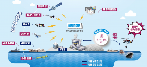 이에 해양경찰은 함정, 해상교통관제, 항공기, 위성, 무인 감시자산 등 입체적인 해양감시를 통해 수집한 정보와 부처별로 분산된 각종 해양정보를 융합·분석하는 시스템 및 해양정보융합센터 등 ‘해양정보융합 플랫폼’을 구축하고 있다.