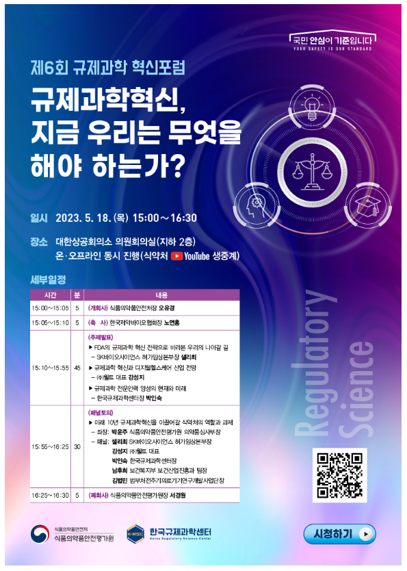 [세종타임즈] 식품의약품안전처는 산·학·관이 함께 처 승격·출범 10주년을 맞아 규제과학 혁신 전략을 모색하기 위해 ‘규제과학 혁신, 지금 우리는 무엇을 해야 하는가’를 주제로 대한상공회의소에서 ‘제6회 규제과학 혁신포럼’을 5월 18일 개최한다.