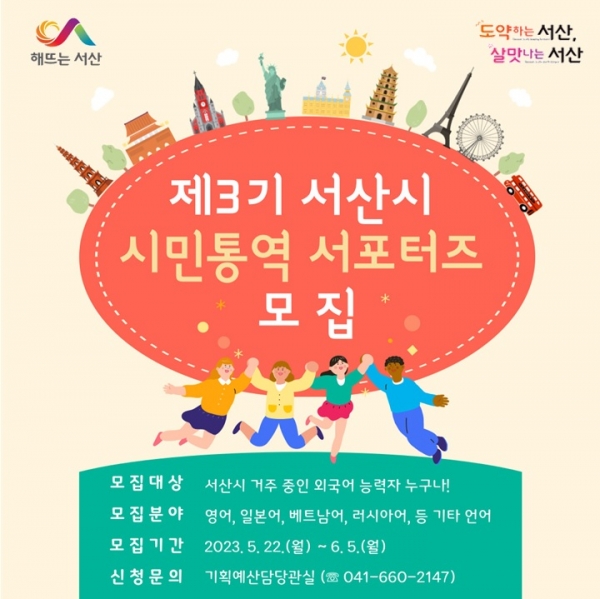 [세종타임즈] 충남 서산시는 외국어에 능통한 시민을 대상으로 22일부터 6월 5일까지 ‘제3기 서산시 시민통역 서포터즈’를 확대 모집한다고 밝혔다.